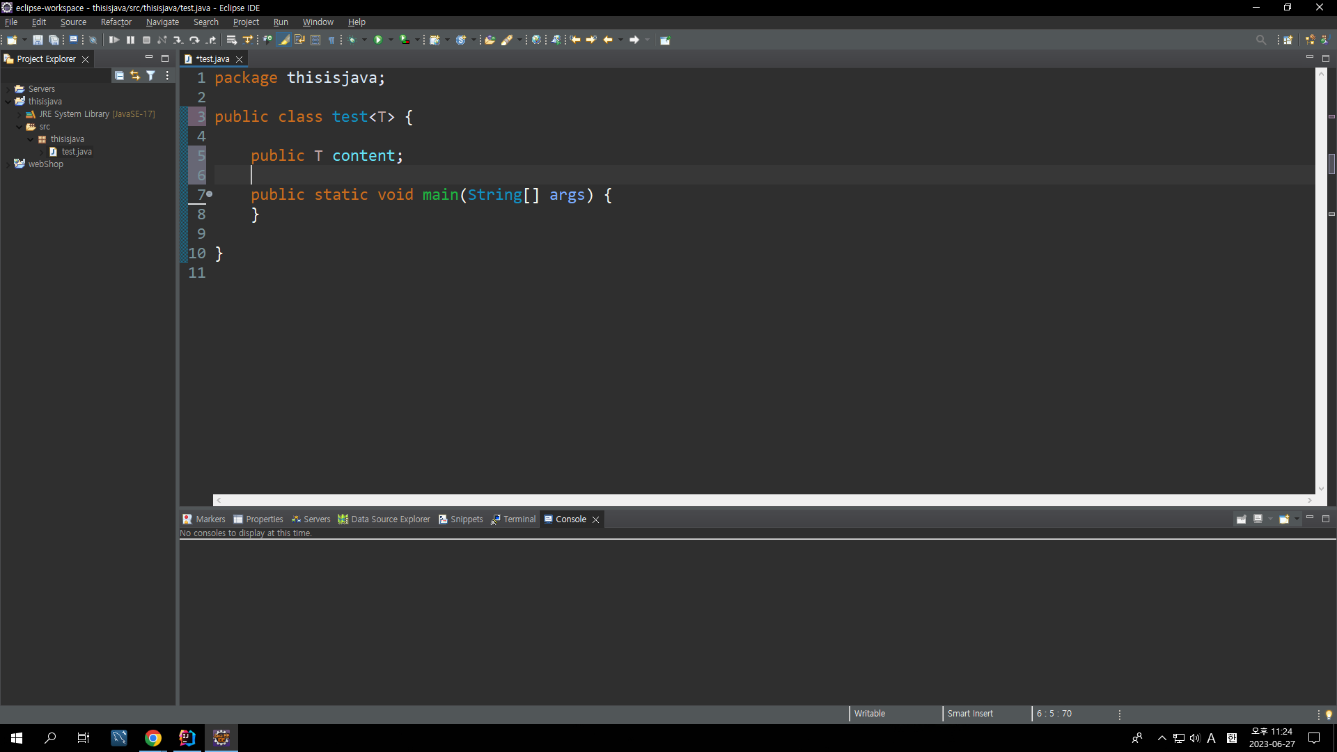 마지막으로 인스턴스를 생성할 때 test <String> t = new test<>();