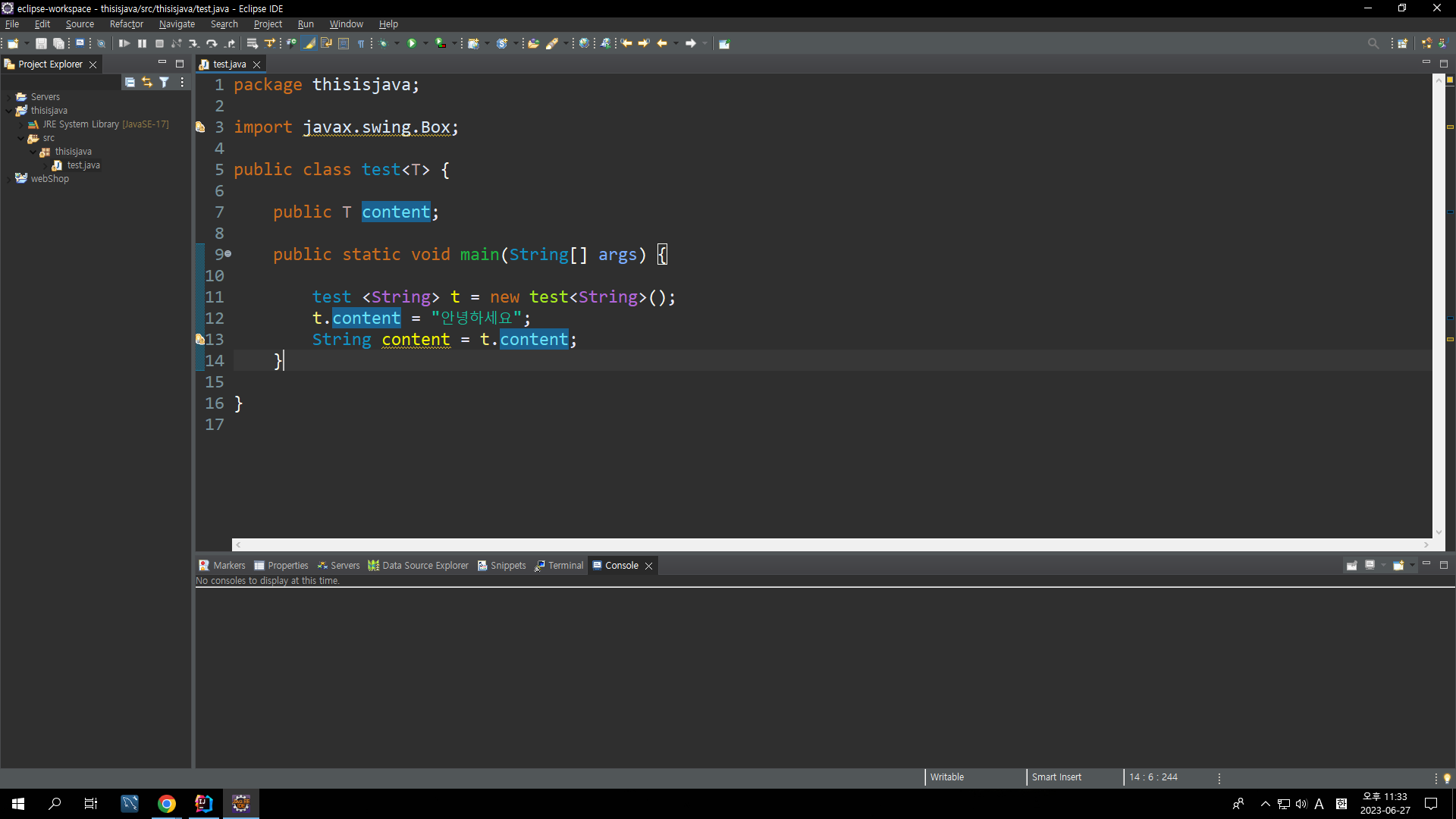 그렇게 되면 무엇이 좋냐??? test 클래스를 이용해 객체(인스턴스)를 생성하고, 그때 인스턴스 필드 content는 타입이 변할 수가 있습니다. 다시말해서 객체가 생성되기 전에는 선언하는 변수의 타입이 아직 미정인데, 객체를 생성하면서 타입이 변경(대체)된다는 것입니다.