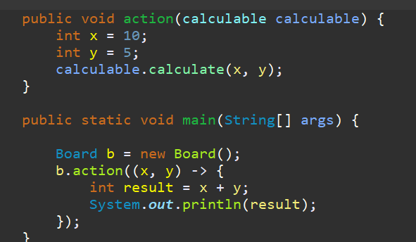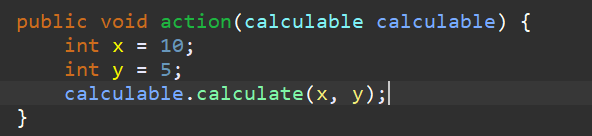 흐름은 test class에서 객체 생성 - 그 객체의 action 메소드 호출 - 호출하려는 action 메소드의 매개변수는 calculable 인터페이스의 구현 객체가 들어와야 함을 의미한다. - 마지막으로 호출한 action 메소드의 데이터 int x, int y 값을 가지고 calculable의 익명 구현객체, 다시말해 람다식(함수)을 실행한다.