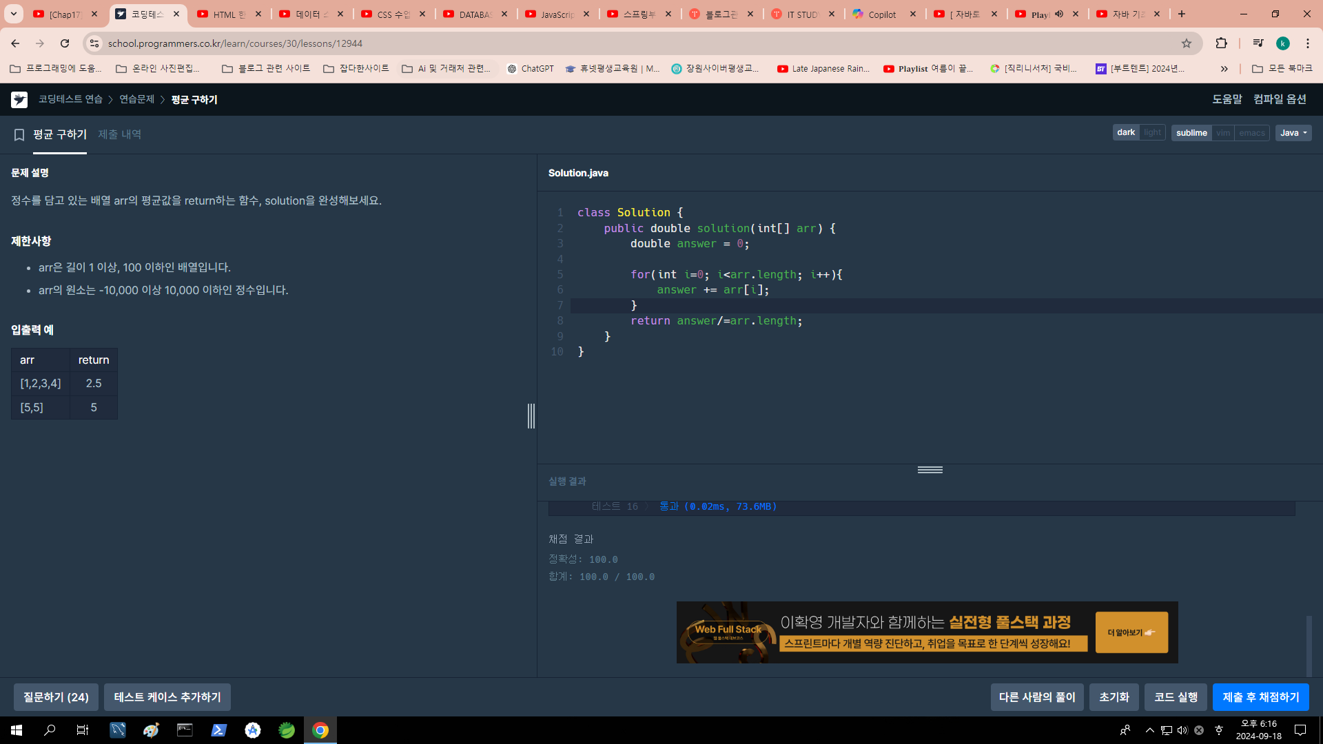 - Arrays.stream(array).average().orElse(0);: 배열을 스트림으로 변환하고, 평균값을 계산합니다. 만약 배열이 비어있다면 orElse(0)에 의해 0을 반환한다고 합니다. 또한 소수점 값까지 표현을 위해서 앞의 return을 Arrays.stream(array).average().orElse(0.0);와 같이 수정하고 반환타입도 double로 변경하면 됩니다.