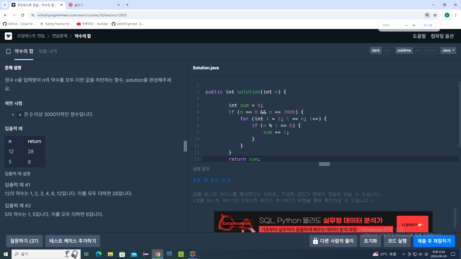| 프로그래머스 lv1 - 나머지가 1이 되는 수 (2) | 2024.09.30 |