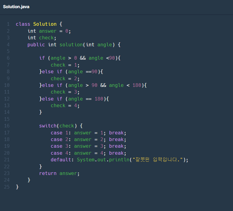 return angle == 180 ? 4 : angle > 90 ? 3 : angle == 90 ? 2 : angle < 90 ? 1 : 0;반응형