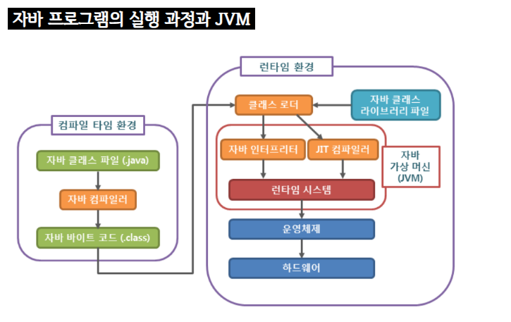 자바의 바이트 코드가 클래스 로더라는 것을 통해 자바 런타임 환경으로 로딩하고, 이를 JVM에 가져다 주면 두 가지 방식을 혼용해서 바이트 코드(기계어의 중간 단계?)를 기계어로 해석한다는 것을 알게 되었습니다.